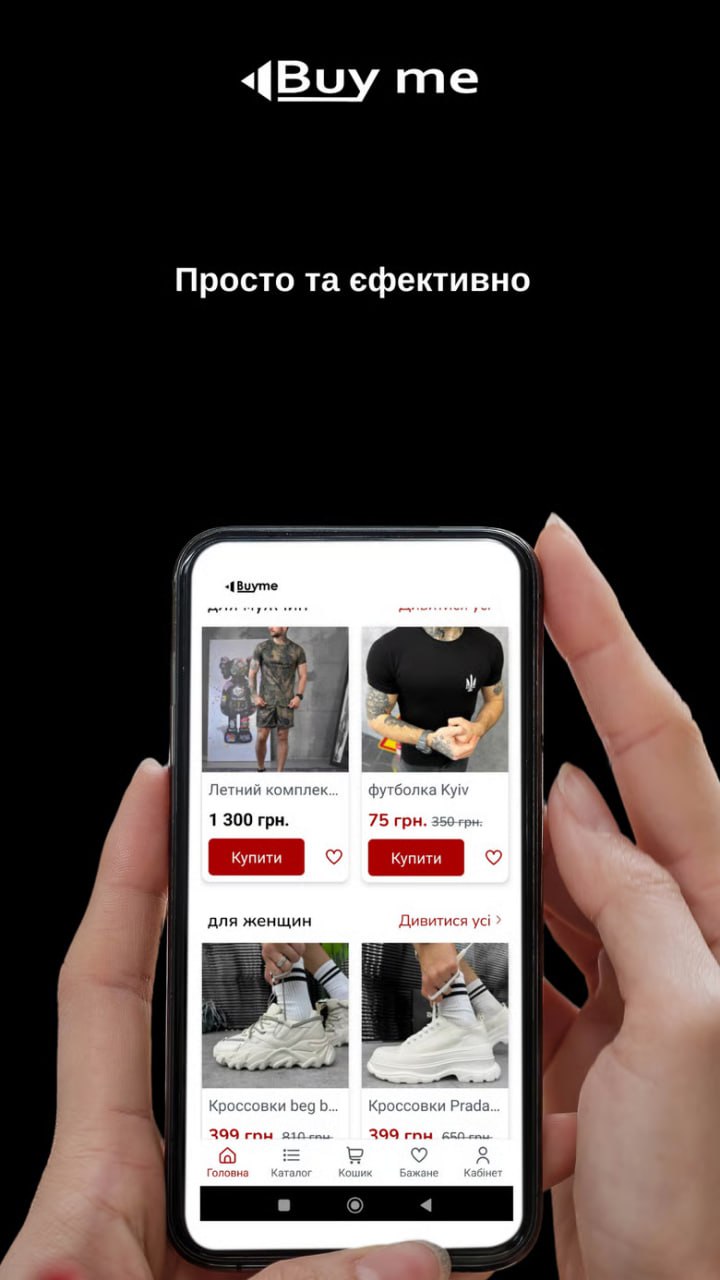 Buy me — мобільний застосунок для швидкого продажу товарів у форматі дропшипінгу. Основна мета — дати користувачу зрозумілий та швидкий шлях до покупки або керування власним магазином.